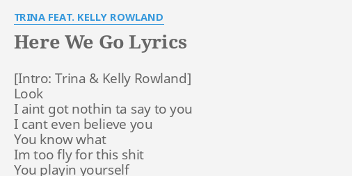 The Lyrics for Here We Go by Trina feat. Kelly Rowland Thats why Im packin up my jewels. You know what Im too fly for this shit You playin yourself Here we go Here we go again Now you tellin me That she is just a friend Then why she callin you At 3 oclock in tha mornin I cant take this no more No No No Here we go Here we go again Now.