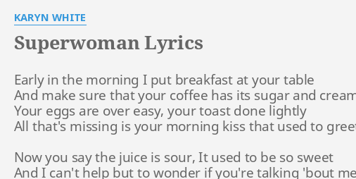 It became her second US. Superwoman is a song by RB singer Karyn White. Early in the morning I put breakfast at your table And make sure that your coffee has its sugar and cream Your eggs are over easy your toast done lightly All thats missing is your morning kiss That use to greet me Now you say the juice is sour It used to be so sweet And I cant help but to wonder If youre talking bout me We dont talk the way we used to talk Its hurting so deep Ive got my pride I will not cry But its making me weak Im not your Superwoman.